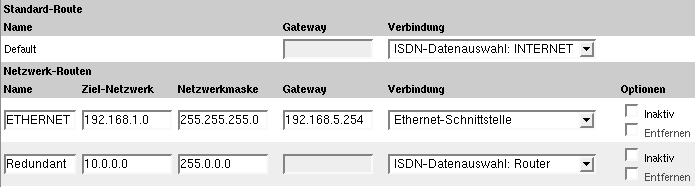 Über ISDN wird die Einwahl bei einem Provider ermöglicht, um eine Verbindung zum Internet herzustellen. Auf diese Weise kann das Kamerabild periodisch per FTP auf dem Webserver www.meinefirmaxyz.de aktualisiert werden, wo die Webseiten der Firma abgelegt sind. Außerdem ist so das Versenden von E-Mails über frei zugängliche E-Mail-Dienste (im Beispiel über den Server smtp.mymailserver.de) möglich. Mittels ISDN erfolgt auch die Einwahl in einen ISDN-Router, über den im Alarmfall die redundante Verbindung zum Sicherheitsrechner 10.0.1.120 hergestellt wird.